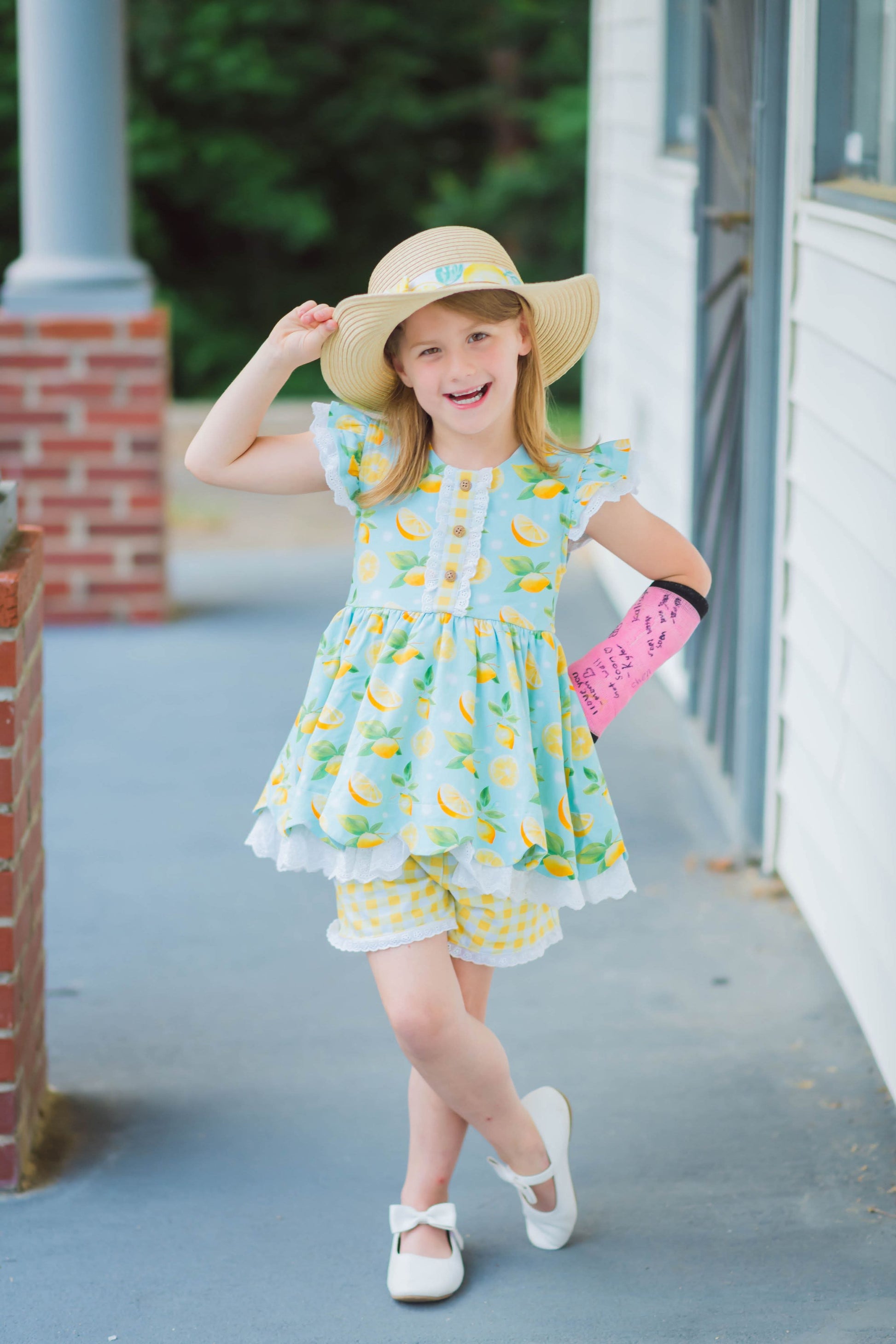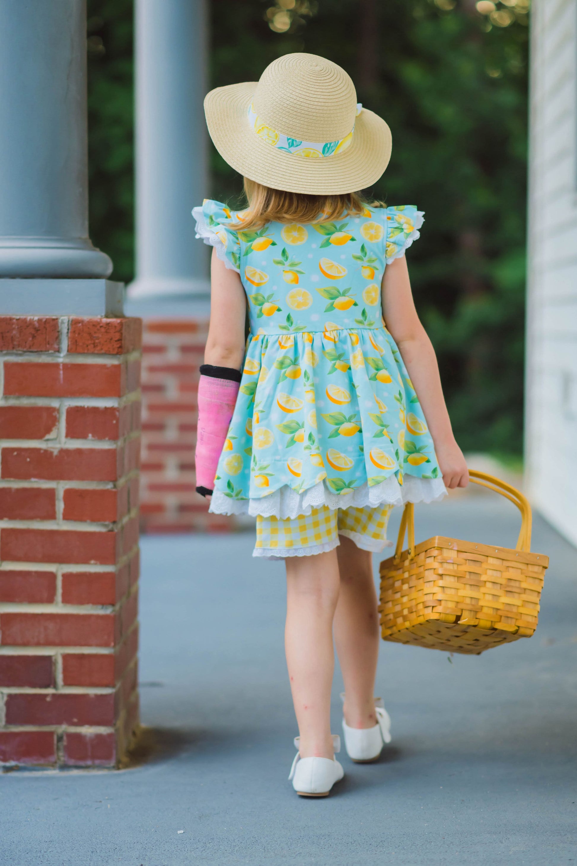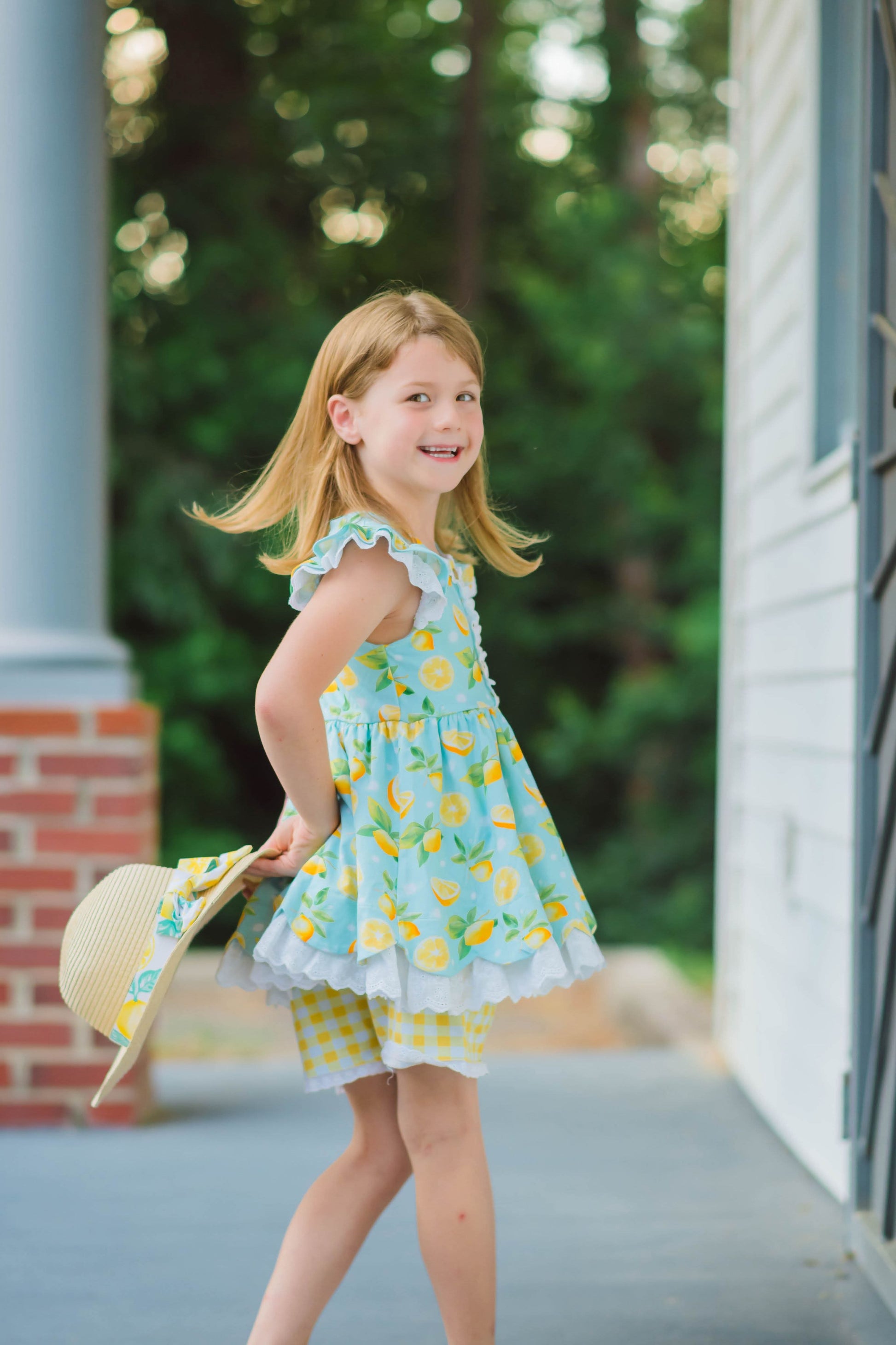 This lemon and gingham play set is simply adorable. The top has the prettiest blue background with lemons. The top also has flutter sleeves with white lace. The second layer has white lace and there is also white lace on the bodice. The bodice also has the cutest wooden buttons. The top also has a scalloped hem line. The short are a yellow gingham with front pockets and a white lace hem. This is great for summer and to transition to fall with leggings.