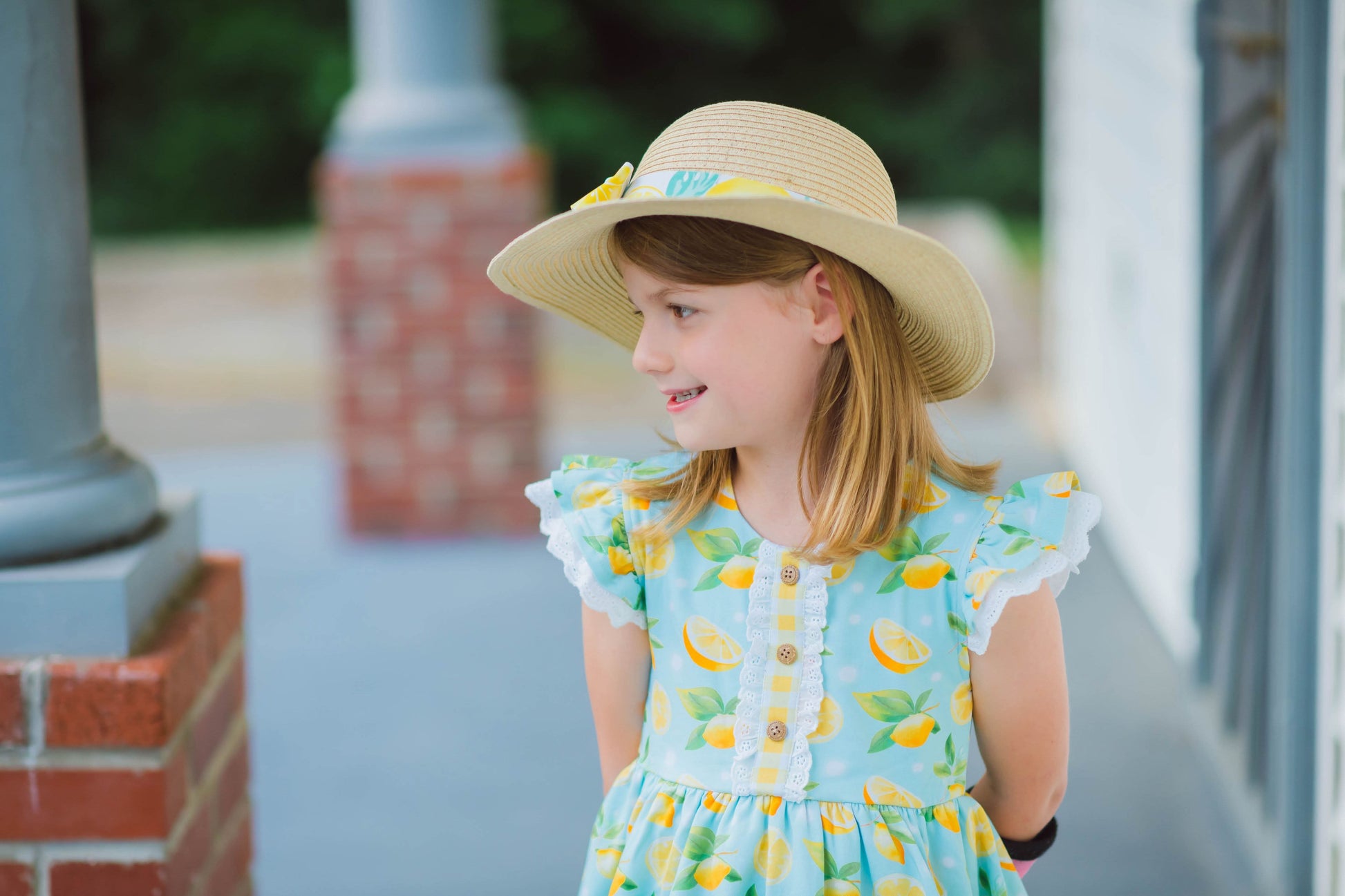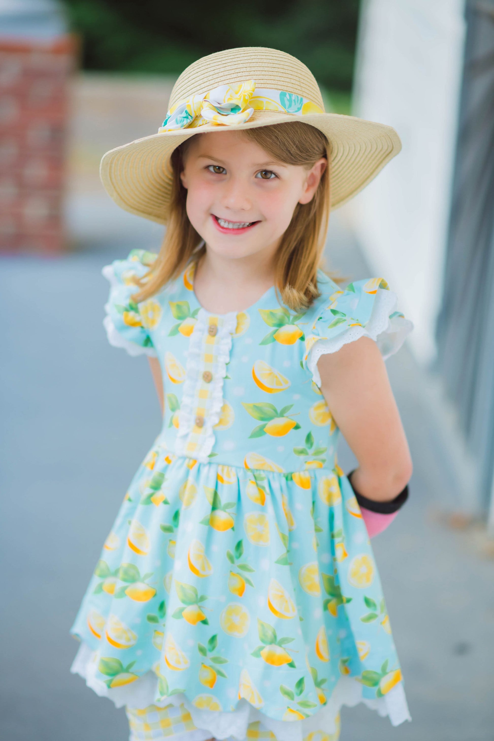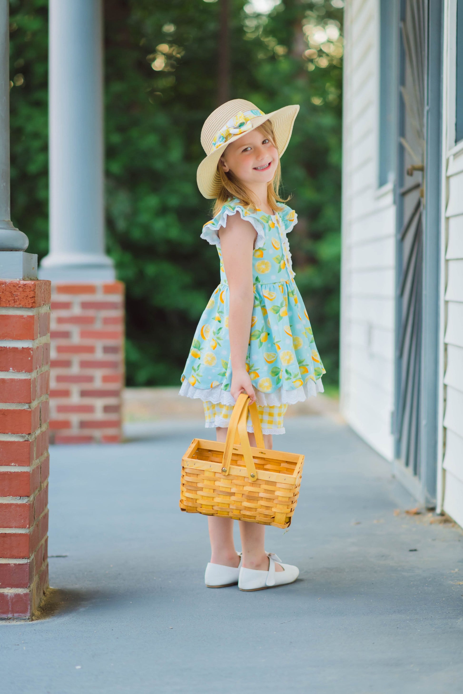 This lemon and gingham play set is simply adorable. The top has the prettiest blue background with lemons. The top also has flutter sleeves with white lace. The second layer has white lace and there is also white lace on the bodice. The bodice also has the cutest wooden buttons. The top also has a scalloped hem line. The short are a yellow gingham with front pockets and a white lace hem. This is great for summer and to transition to fall with leggings.