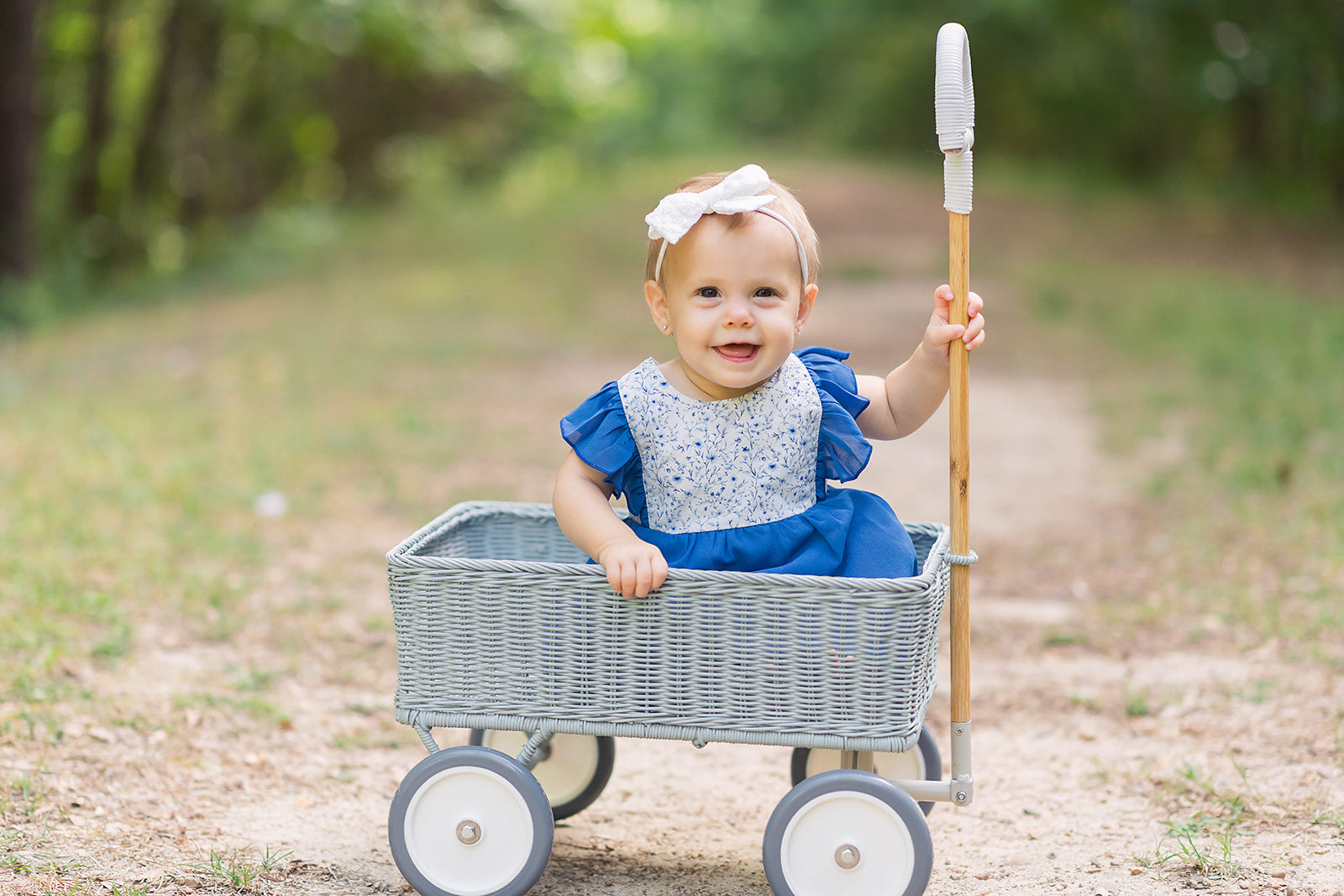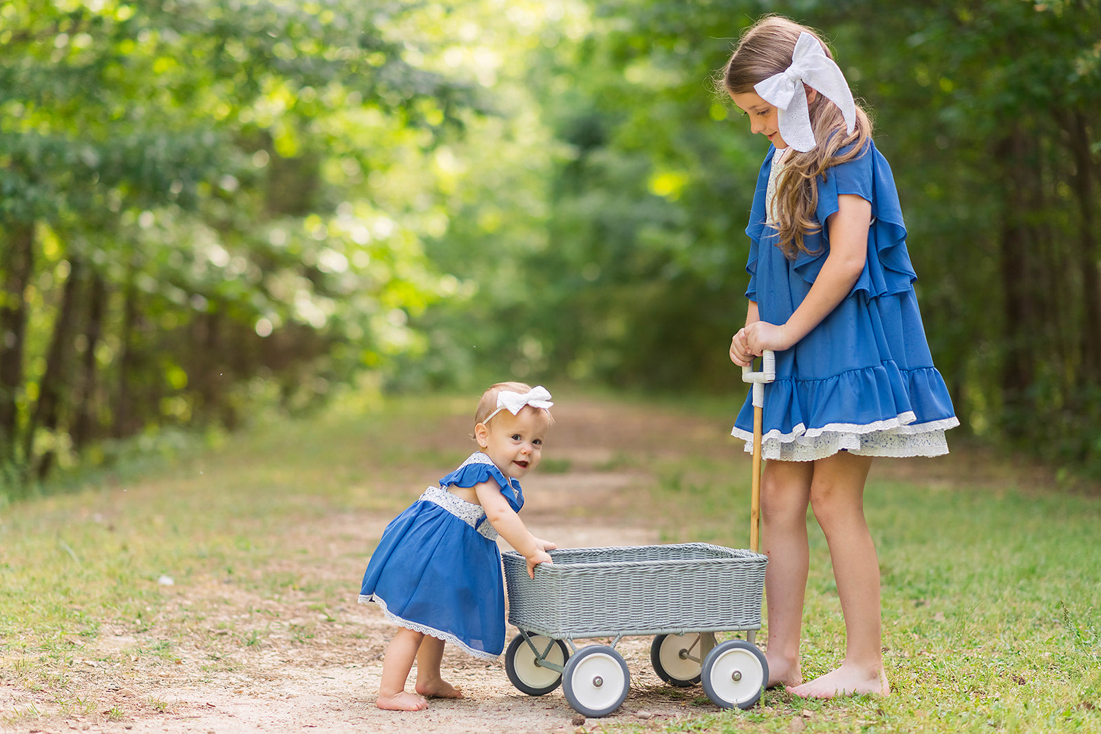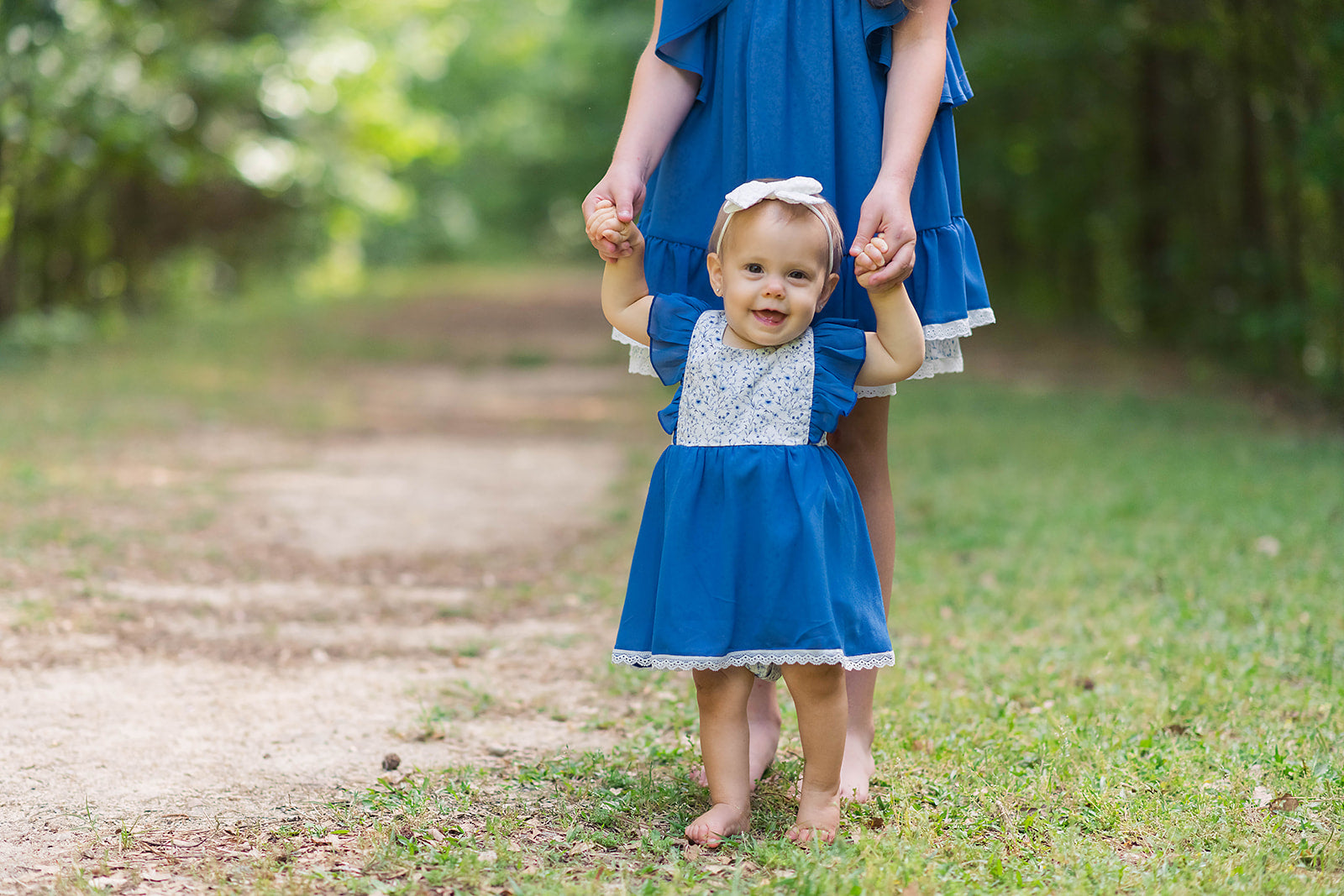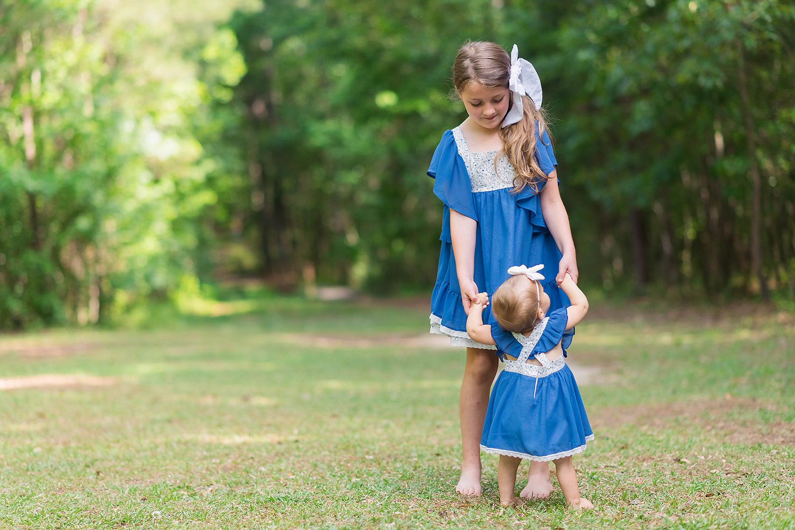 This Summer Blue Floral Romper is precious. This is a skirted romper with adjustable straps. The romper fabric is a woven cotton with a gorgeous blue floral print. The ruffles on the straps and skirt are a blue chiffon. The skirted chiffon is trimmed in a pretty white lace. The buttons at the bottom of the romper make it easy for changing. The straps in the back of the romper are adjustable to help with sizing. This is such a timeless piece and great for summer and into early fall with a layering shirt. This is also a perfect match for the Summer Blue Floral girl's 2 piece set and boy's shirt.